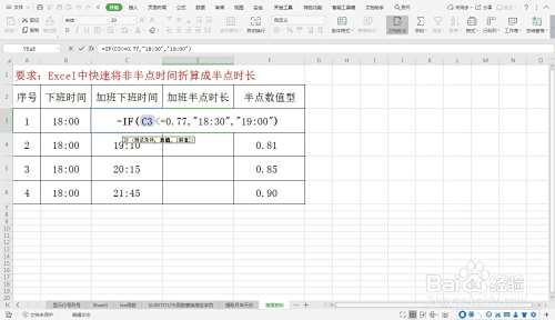 选择E3单元格,输入【if函数】=IF(C3<=0.77,"18:30","19:00")。