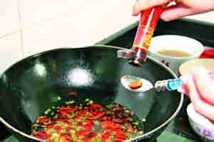 4、烧热3汤匙油,加入1汤匙花椒炒香,捞起弃之,留锅中油,倒入姜蒜末、葱白末和干辣椒炒香。