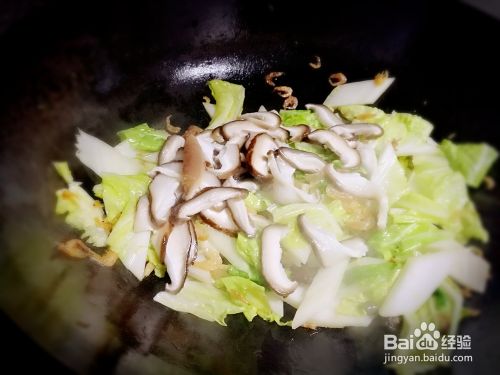 叶子稍微软一点的时候,倒入蘑菇,炒一会。