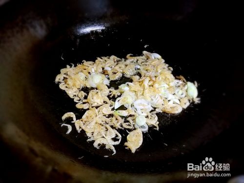 把鸡油加热到六七岁。用葱和姜在锅里炒虾皮。