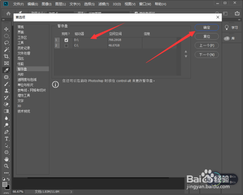 然后我们再点击确定,这样的话,PS运行速度相对来说就会更快一些;