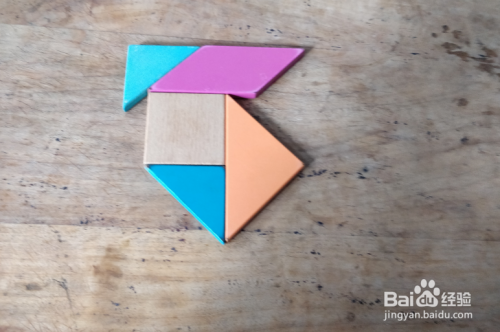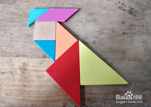 最后摆上黄色三角形,放在红色三角形右侧挨着,如图。鹦鹉鸟就这样拼组好了。