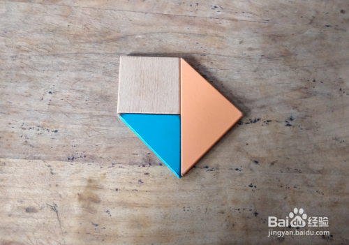 接着摆上橙色三角形,放在正方形右侧挨着,上端一齐,如图。