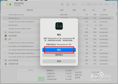 在苹果系统电脑上,通过活动监视器关闭应用程序的方法。