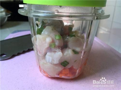腌制好鸡肉之后把姜片取出,将鸡肉块和葱花放入料理机,加入胡萝卜丁,搅打成细腻的泥状。PS:肉泥一定非常细腻才可以哦,否则做出来会有颗粒感,成型度不佳。