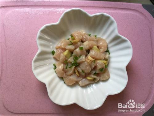 鸡胸肉切小块,香葱切末,鸡胸肉中放入葱末和姜片,搅拌均匀腌制 10 分钟,去除鸡肉的腥味。