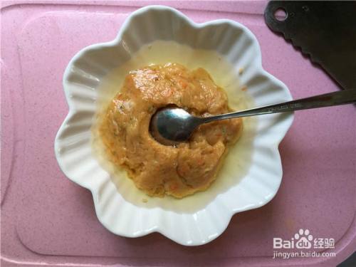 倒入核桃油再顺着同一个方向搅拌均匀,至核桃油和肉糜相互吸收。