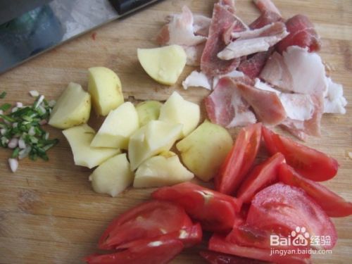 准备食材工作:豆角去筋洗净,茄子洗净撕成条,土豆去皮切块,猪肉切片,西红柿洗净切块,葱切末