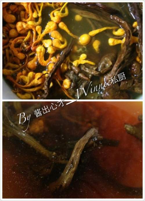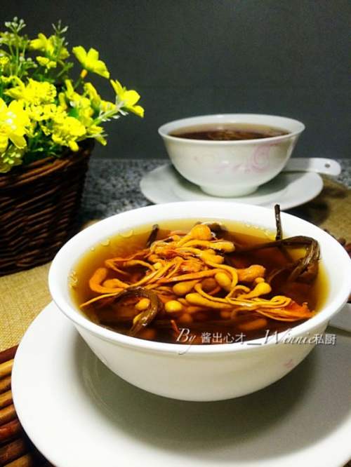 2一边炖就一边能到茶树菇与虫草花混合的香味,汤色浓郁......炖好后再加1.2味勺盐,就可以享用美美的汤水喽!