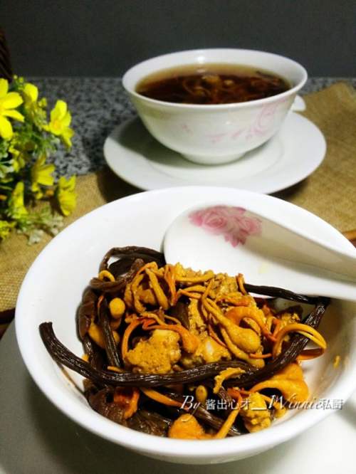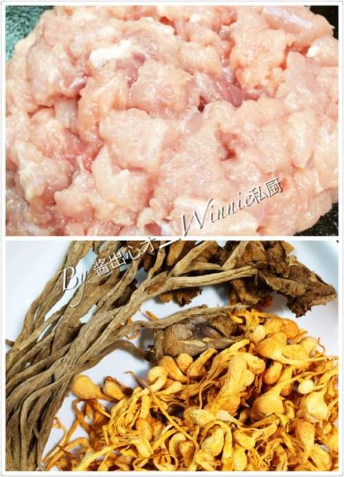 1将瘦肉剁碎,茶树菇与虫草花过水冲洗一下,连同密枣一同放入炖锅中,加入热开水(凉开水),慢火炖3-4小时