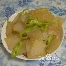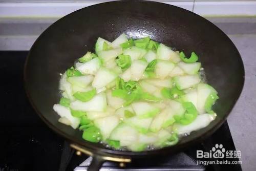 锅内倒入少许油,放入葱花炒香,放入冬瓜片翻炒至变软后放入青椒片翻炒2分钟。