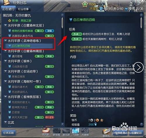 进入任务日志中,找到水月平原(武神塔修炼)选择这个任务做了。到红叶山庄丰登工会找青儿去对话。就可以完成了。