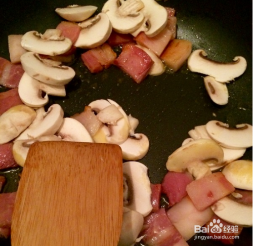 蘑菇片和培根切成大小差不多的片,黄油切一块备用,约20克,如果做一人份的,黄油10克就够了