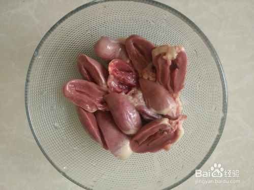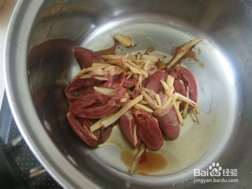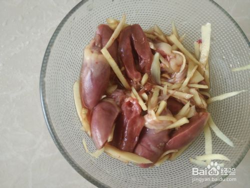 鸡心清洗干净,然后把每个鸡心切成两边,放到碗中,加适量的盐、姜丝、生抽、料酒腌制十几分钟。