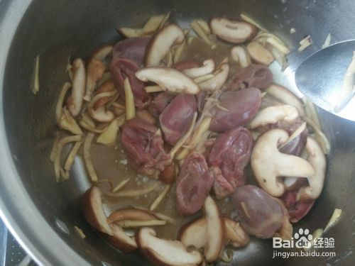 用一个小锅,开小火,下少量的油,然后放鸡心进去翻炒一下,再放香菇进去混合翻炒30秒左右。