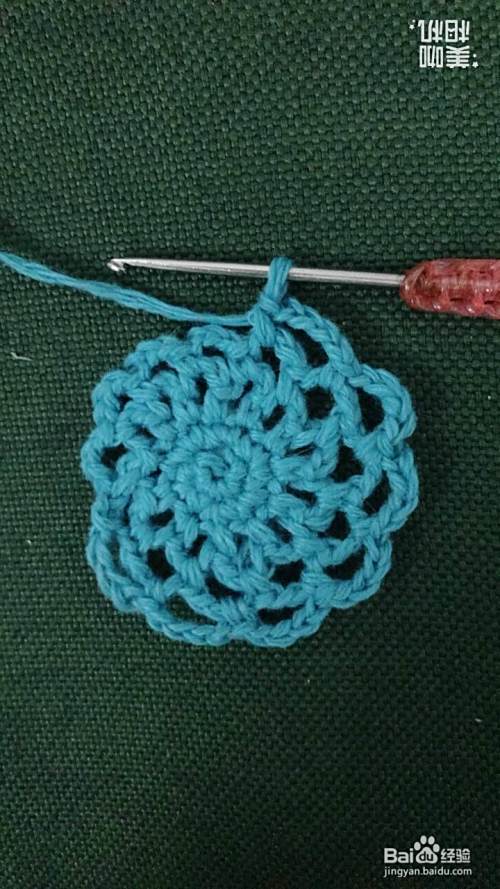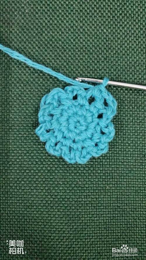 在小花孔里面下针,拉花4针,紧锁到第二个小花孔里面,,按此方法,钩出12个小花孔,完成一圈。