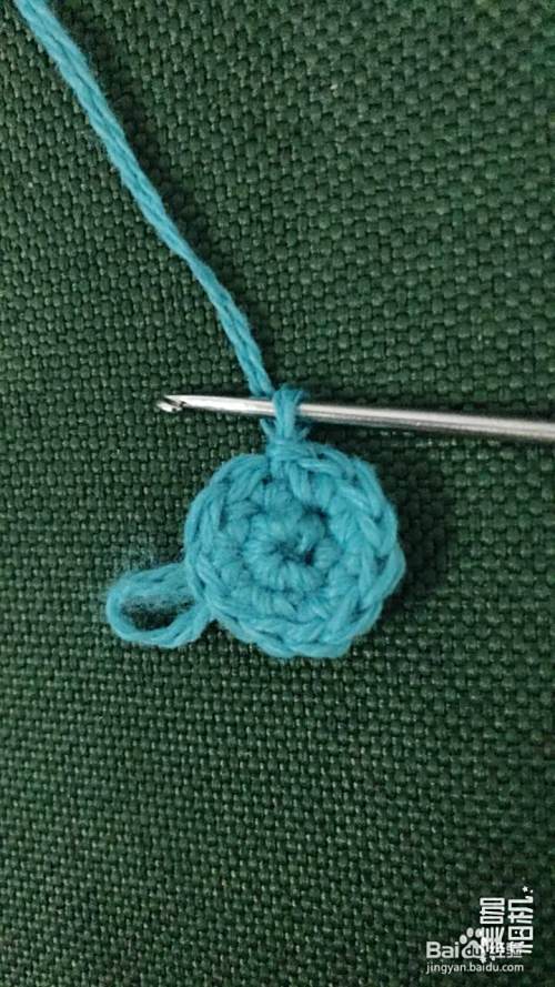 首先用钩针线钩出一个活头结线圈,在这个活头结线圈里面先锁针6针,紧锁到第一针锁针针孔里面,拉紧活头结线圈,形成一个小花心。