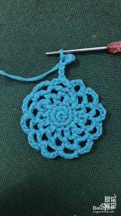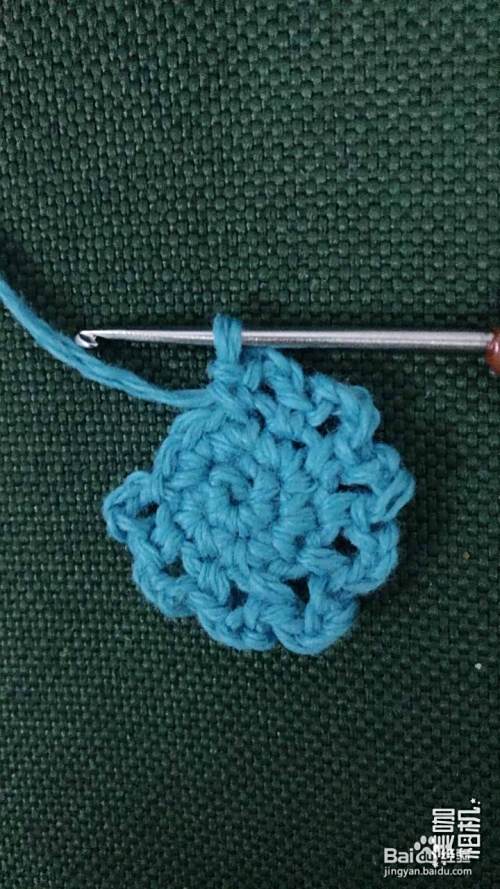 第一针针孔处拉花3针,紧锁到第二针针孔里面,钩出一个小花孔,按此方法,钩出12个小花孔,完成一圈。