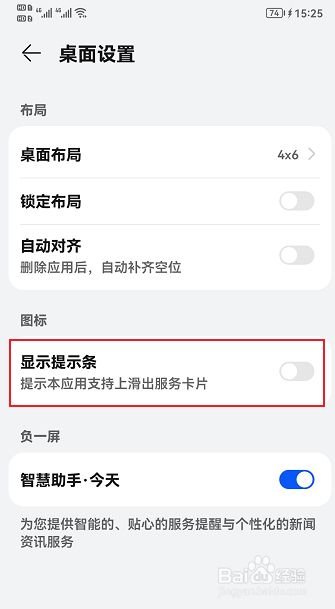 进入桌面设置后,在图标版块下可以看到“显示提示条”。