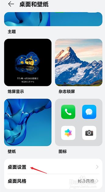 在桌面和壁纸的设置中,找到下方卡片中的“桌面设置”。