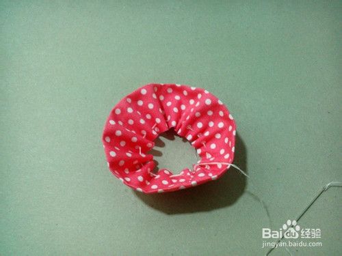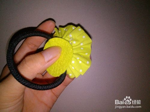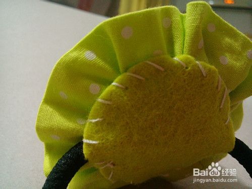 完成第5步后,发圈对花朵底部中间,再将不织布圆片如图缝合。