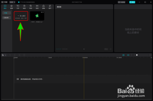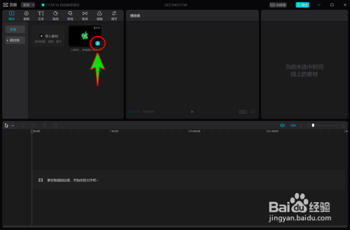 点击导入的视频素材右下角的小加号,将视频素材添加到编辑轨道上。