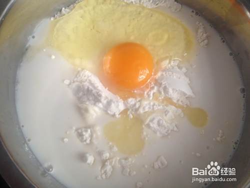 面粉里面,加入牛奶,鸡蛋,食用油,酵母粉。炸油饼和面有讲究,一定要加鸡蛋和油和面,这样做出来的油饼外皮酥脆,里面松软。