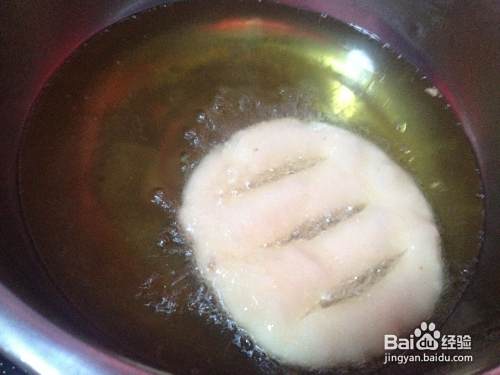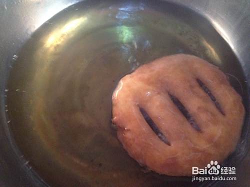 放入画好刀的油饼,中小火炸1分钟左右,来回翻面儿。