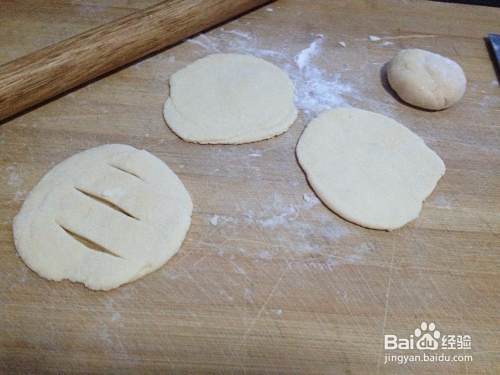 用擀面杖擀开,拿刀在面片上划上三道,这样炸的油饼漂亮还容易熟。