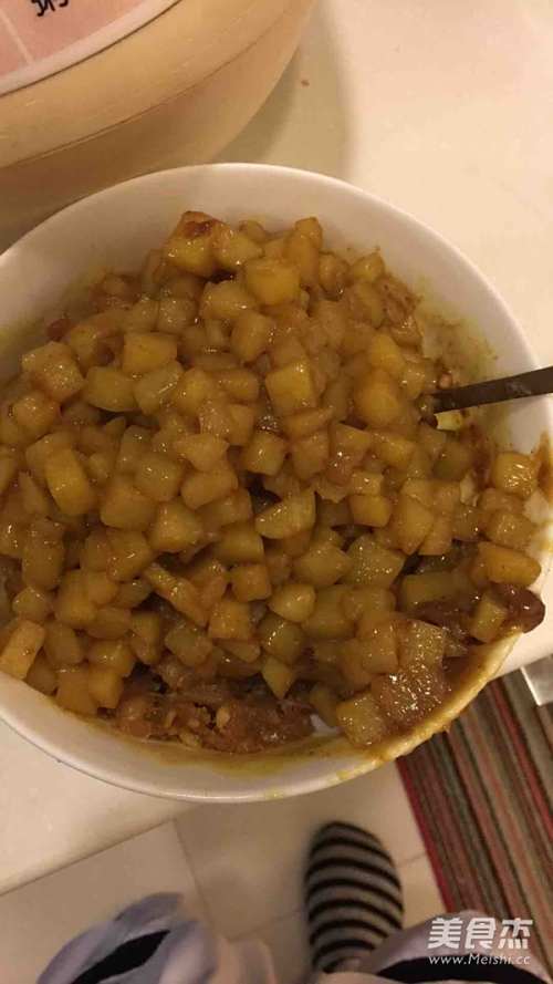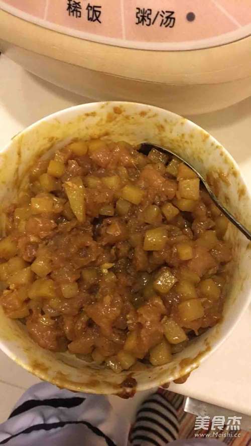 鸡胸肉切小块剁碎,加入料酒,盐,糖,姜末,还有化开的咖喱油拌匀,加入炒好的土豆和馅,搅拌均匀。