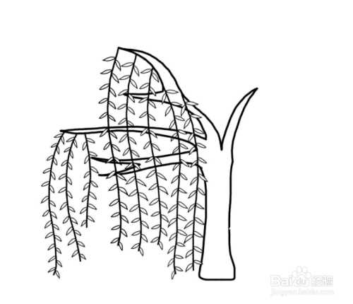 如图,第五步,接着画出右边柳枝和叶子的轮廓。