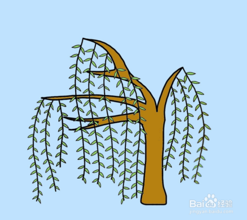 第六步,最后用彩笔涂上相应的颜色,这样柳树的简笔画就画好了。