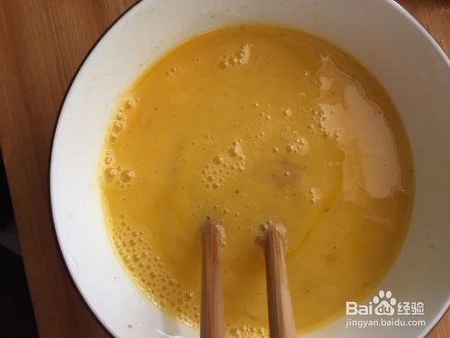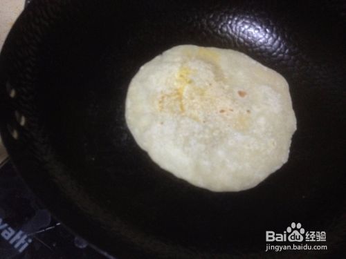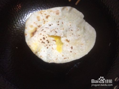 等饼起大泡,用筷子扎一个洞,灌入打散的鸡蛋。