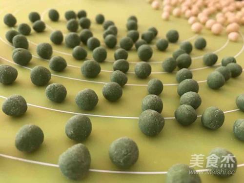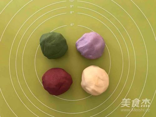 1取45g糯米粉、2g抹茶粉和开水(约28g,开水的量以能揉成柔软的面团为准)揉成面团;同样再用2g紫薯粉、2g芒果粉、1.5g红曲粉分别与45g糯米粉和开水揉成面团