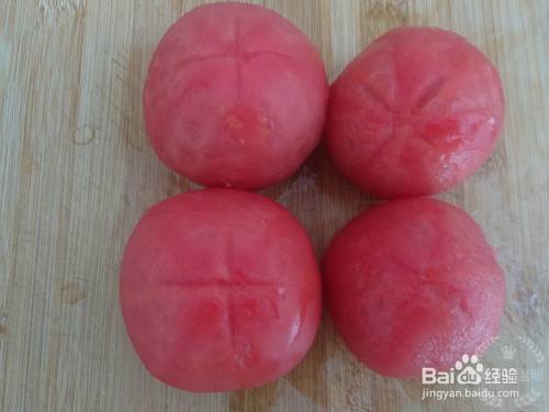 西红柿去蒂洗净,在顶部打上十字花刀,放在热水里浸泡两分钟。