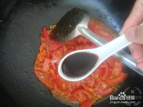 5:煸香蒜末,倒入西红柿煸炒出红汁来。