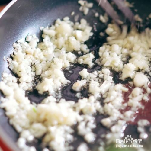 锅里倒适量油,加热后,放入蒜末。关火用余温炒香蒜末。再加一勺糖和适量盐,搅拌均匀。