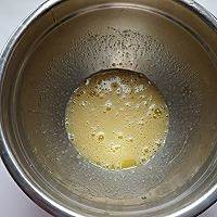 鸡蛋打入盆里加入白糖,水,植物油用手抽搅打完全融合,至少搅打2分钟