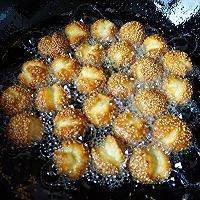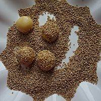 搓圆,把小剂子用湿布滚潮湿,放入白芝麻里面滚一下再用手团实一些