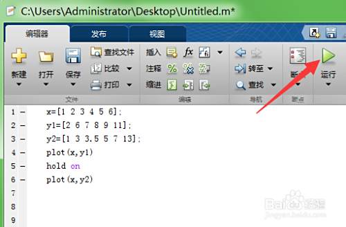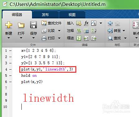 接着如下图,添加linewidth指令,即可设置粗细,这里设置为3,点击运行按钮,即可开始执行。