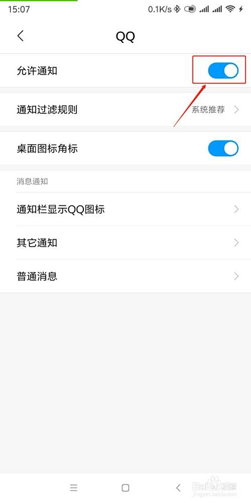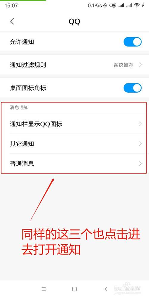然后在下面,把通知栏显示QQ图标、其他通知、普通消息,三个选项的通知也打开,这样就可以把消息显示出来了;