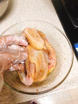 重点是要腌制2小时以上,3小时更好。为了入味可用牙签在鸡上面扎满小洞。