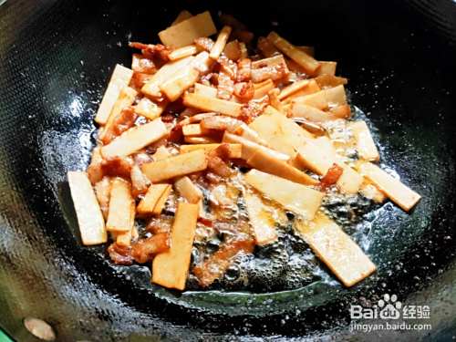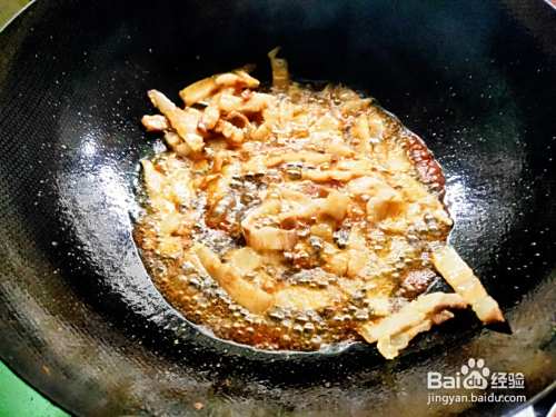 将切好的肉片倒入锅中,翻炒,加入酱油,蚝油和白糖调匀的酱汁放入锅中,炒出酱香味。