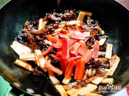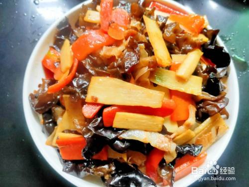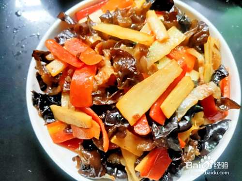 加入焯水后的木耳和胡萝卜片,翻炒均匀后起锅装盘。