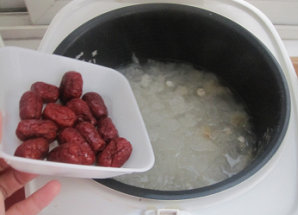 银耳羹结束炖煮后,将清洗干净的红枣和冰糖一起再次放入煲内,按“汤/粥”功能,然后按“开始”,20分钟后,主动关掉电饭煲,拔掉电源,吃时加入牛奶即可。