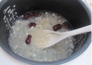 要吃银耳羹的话,则不用放薏仁和红枣,直接将浸泡好的银耳及水放进电饭煲预约炖煮即可。