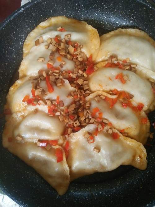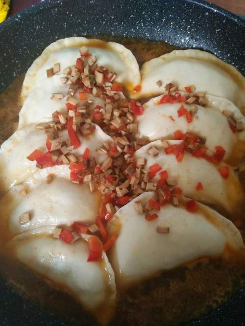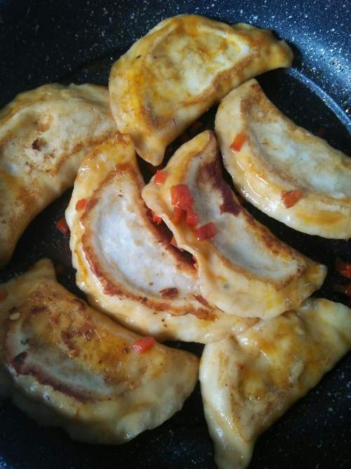 7锅热刷油,饺子摆入锅,浇汁倒入饺子的一半盖盖子,小火汁烧干闷一会