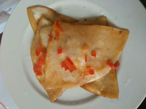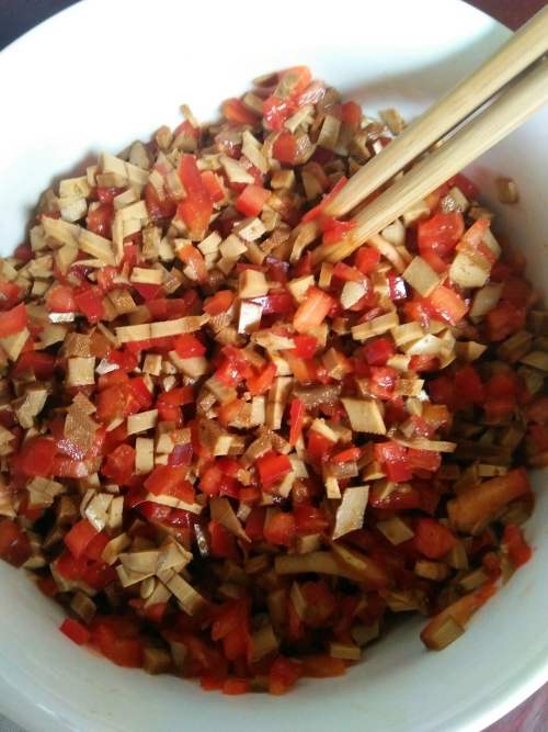 6锅贴的馅是甜椒豆腐干的,低热量噢!少油少盐