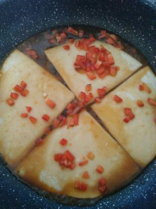 4平底锅预热刷一层油,把面片放进去,浇汁均匀倒入,微微没过面片即可,盖盖子小火,汁烧干闷一会