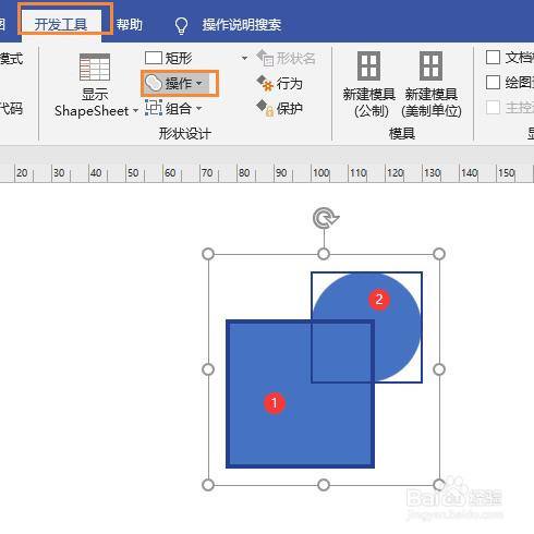 鼠标点击先选中正方形,再选中圆形。点击菜单栏【开发工具】,找到【操作】。